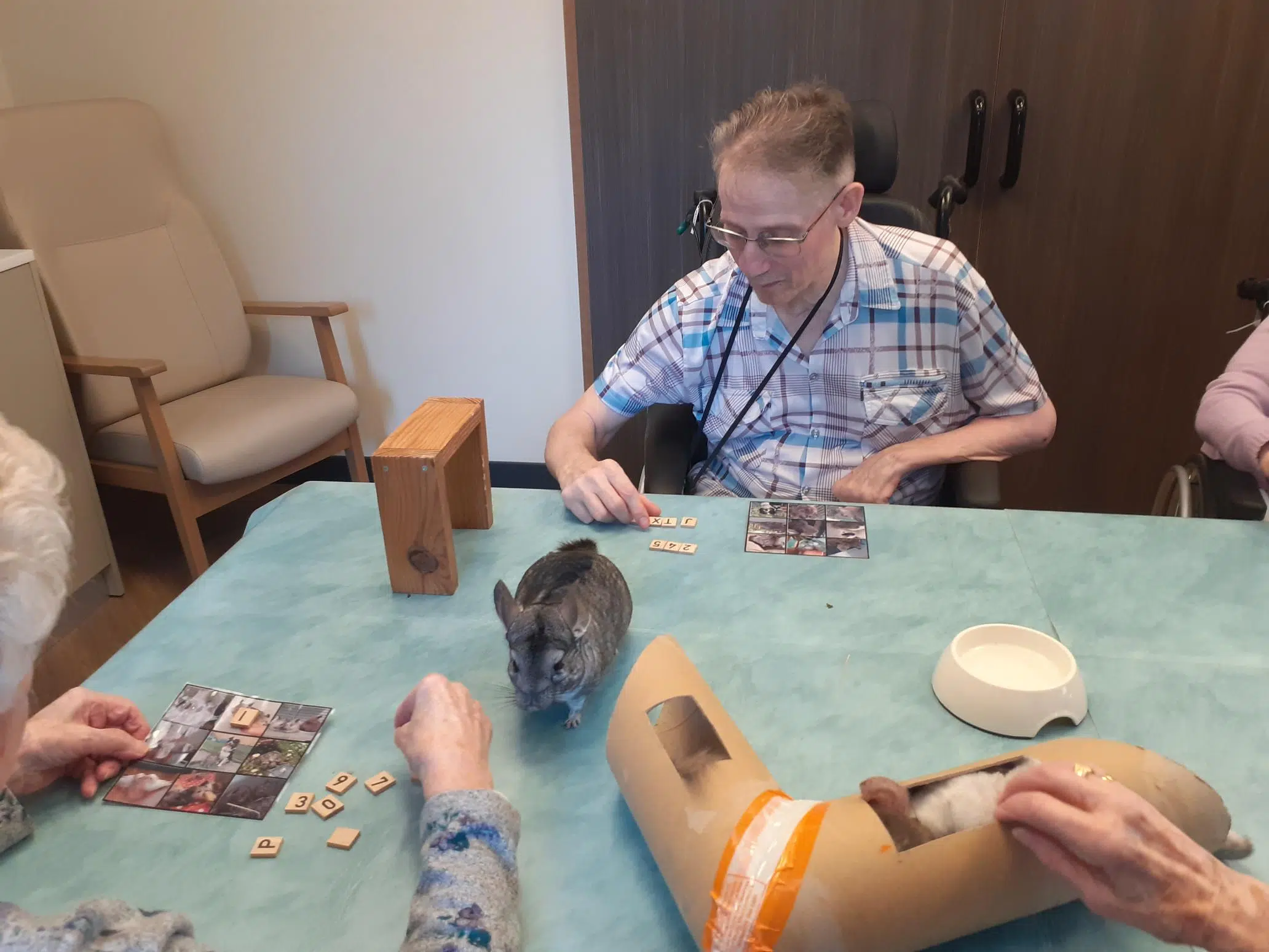 La zoothérapie a également été un moment fort : les chinchillas, avec leur fourrure soyeuse et leur nature curieuse, ont conquis le cœur des résidents. Leurs petites visites ont apporté apaisement, tendresse et beaucoup de sourires.