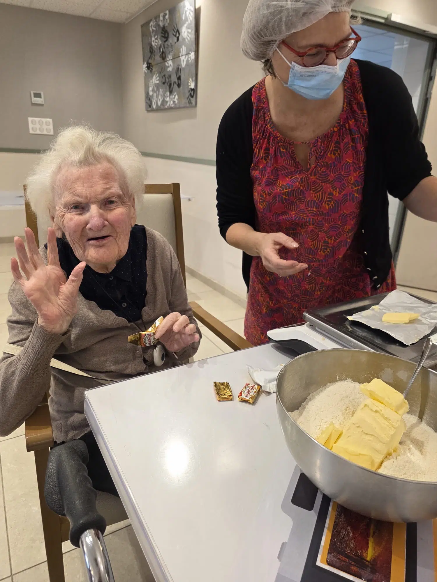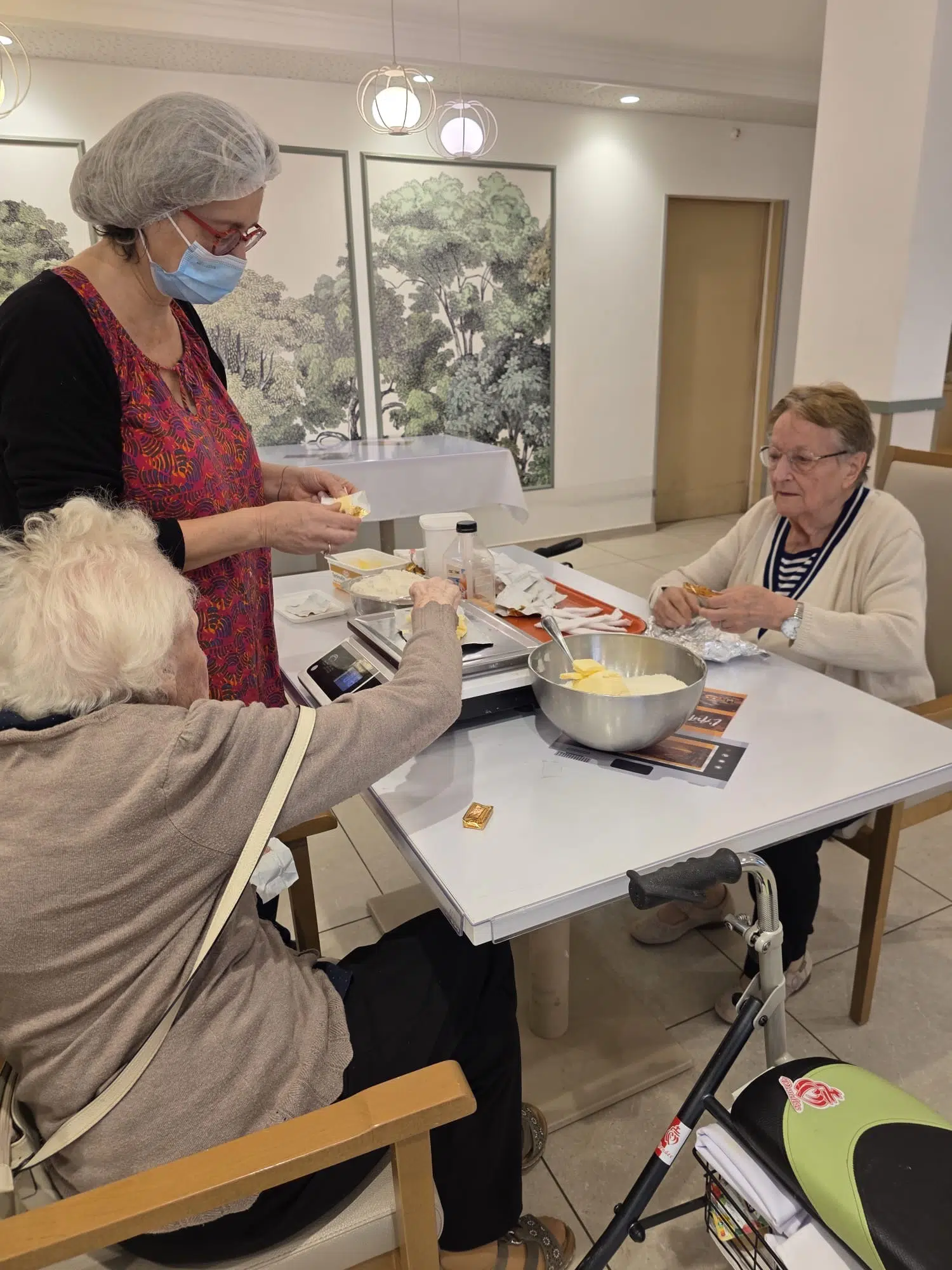 Très vite, les activités se sont enchaînées, alternant ateliers culinaires et créations manuelles, pour le plus grand bonheur des résidents. En cuisine, l’ambiance était aussi joyeuse que gourmande : entre la préparation de gâteaux parfumés et la réalisation de crêpes dorées à souhait, chacun a mis la main à la pâte. Ces moments sucrés rythmés les discussions, ont permis à tous de partager leurs souvenirs et leurs recettes d’antan, dans un esprit de camaraderie et de transmission.