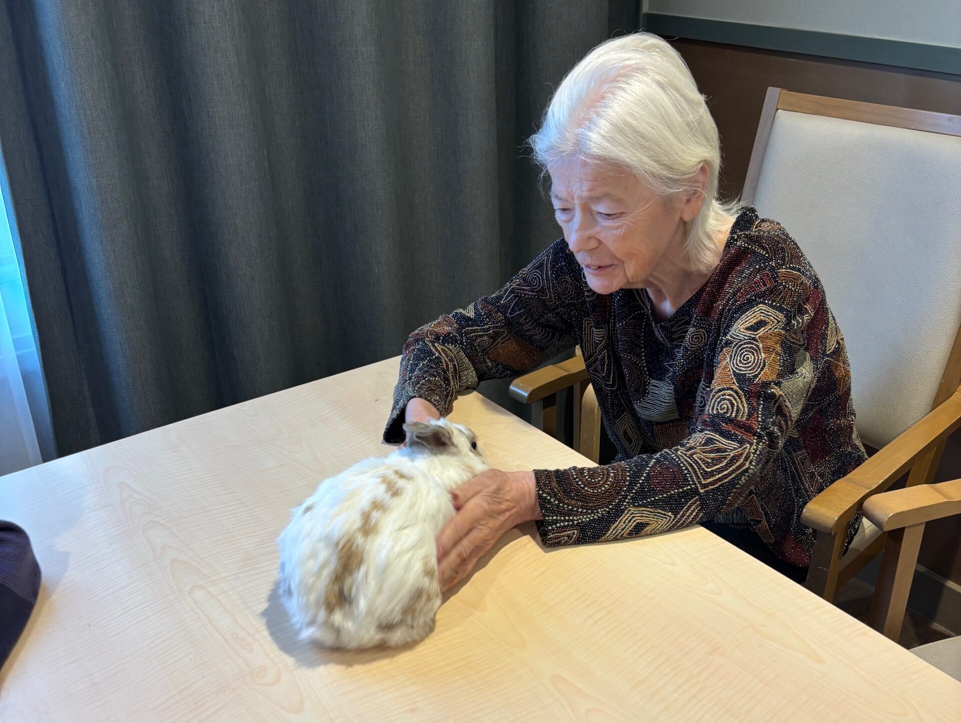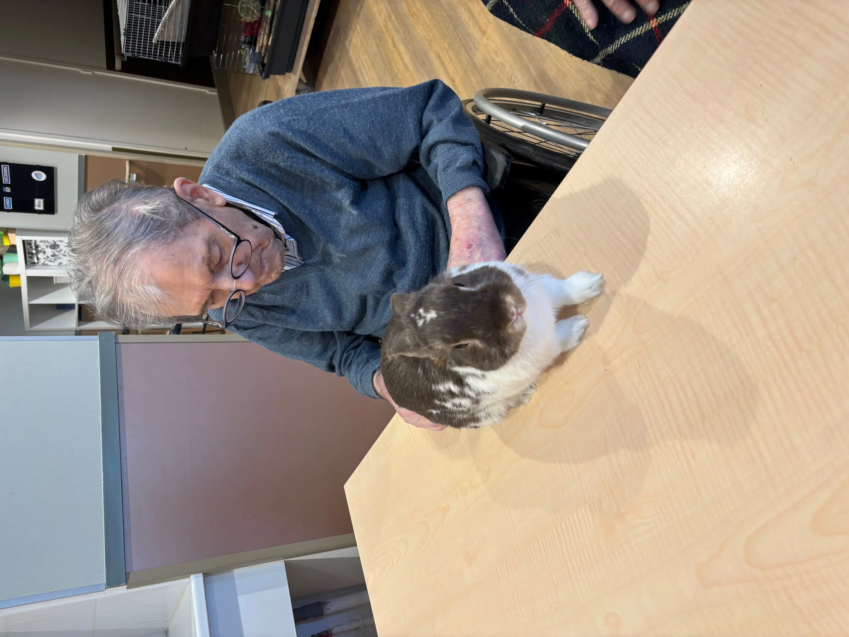 Cette rencontre avait pour objectif de favoriser la détente, la stimulation sensorielle et le bien-être émotionnel des résidents, dans un cadre sécurisant et apaisant. Pour accompagner ce moment privilégié, deux invités très attendus étaient présents : Ricky et Vagabond, nos deux lapins, devenus de véritables médiateurs au fil des séances.