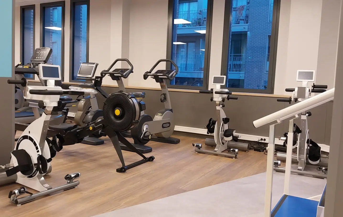 Notre salle est équipée avec de nombreux appareils : vélos elliptiques, ski training, rameur, presse de musculation, Leg curl, Leg extension, abducteur, tapis de course avec analyse de la marche.